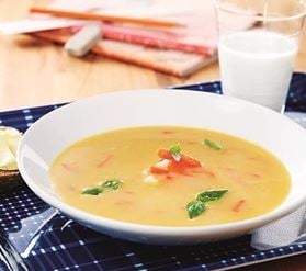- Lisää sulatejuusto ja kasvisrasvasekoite sekä kasvispyreet. Kuumenna.