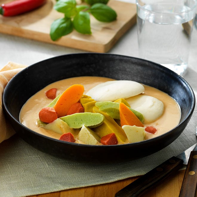 - 3. Tarjoa valmistusohjeen mukaisesti kuumennettujen riisitimbaalien tai perunasoseen kera. Voit halutessasi käyttää curryyn myös broileritimbaalikuutioita. Vinkki! Lado jäiset timbaalit GN-vuokaan, sekoita kylmät kastikeainekset ja kaada vuokaan timbaalien päälle. Peitä tiiviillä kannella ja kuumenna valmistusohjeen mukaisesti.